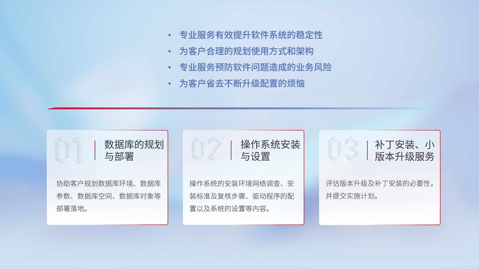 为客户提供软件规模升级、、快速部署、、、按需配置的专业服务,,从数据库的规划与部署到操作系统的安装与设置,,,,再到补丁安装和小版本升级提供支持。。。